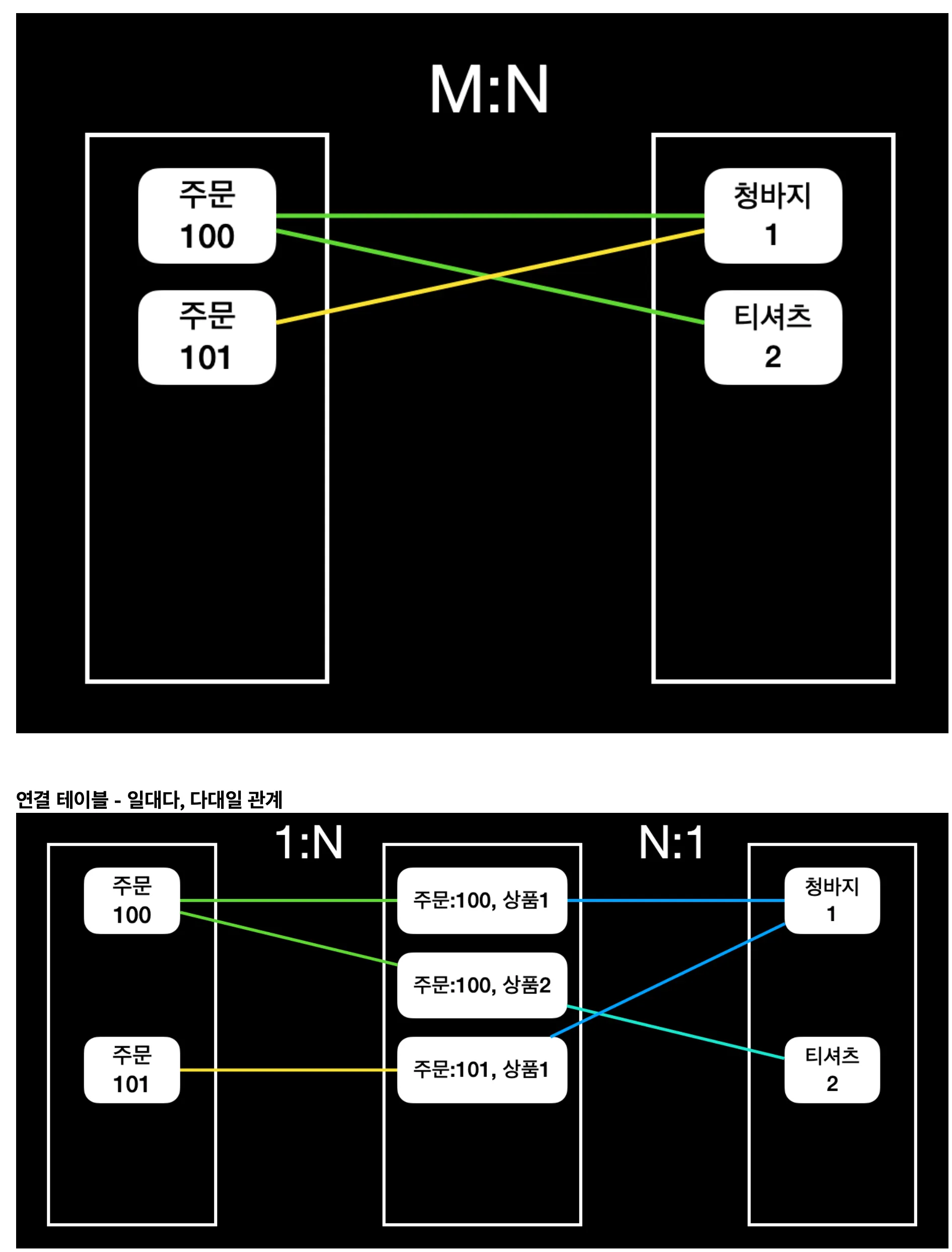 - ๋ ผ๋ฆฌ์ : ์ฐ๊ฒฐ ํ ์ด๋ธ๋ก 1:N + 1:N ๋ถํด
