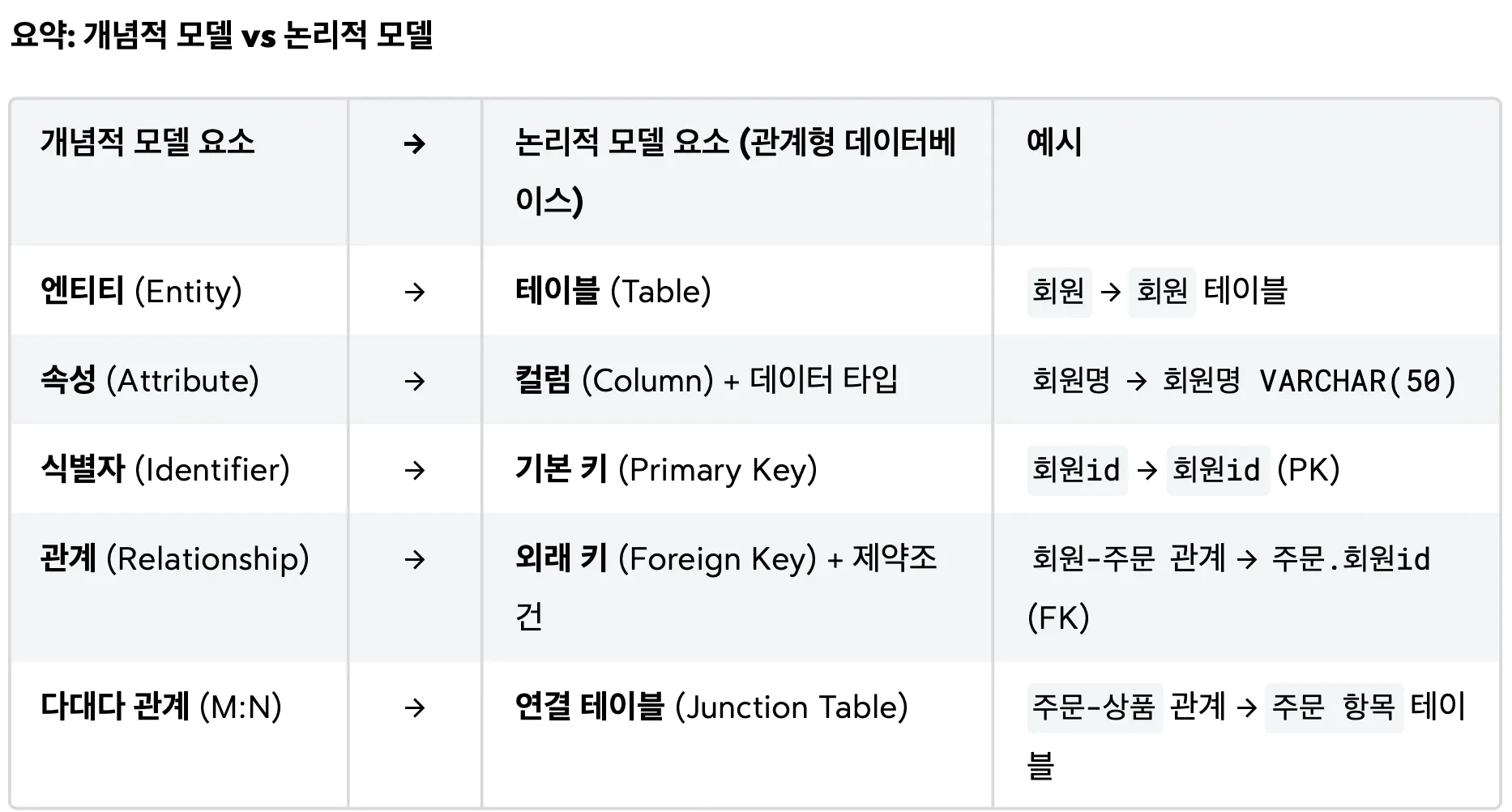 ๋ ผ๋ฆฌ์ ๋ชจ๋ธ๋ง์์๋ ์ฐธ์ฌ๋, ์ธ๋ ํค ์์น, ์นด๋๋๋ฆฌํฐ(1:1, 1:N, M:N)๋ฅผ ์ ํํ ์ค๊ณํด์ผ ๋ฐ์ดํฐ ๋ฌด๊ฒฐ์ฑ๊ณผ ์กฐํ ํจ์จ์ด ๋ณด์ฅ๋๋ค.
